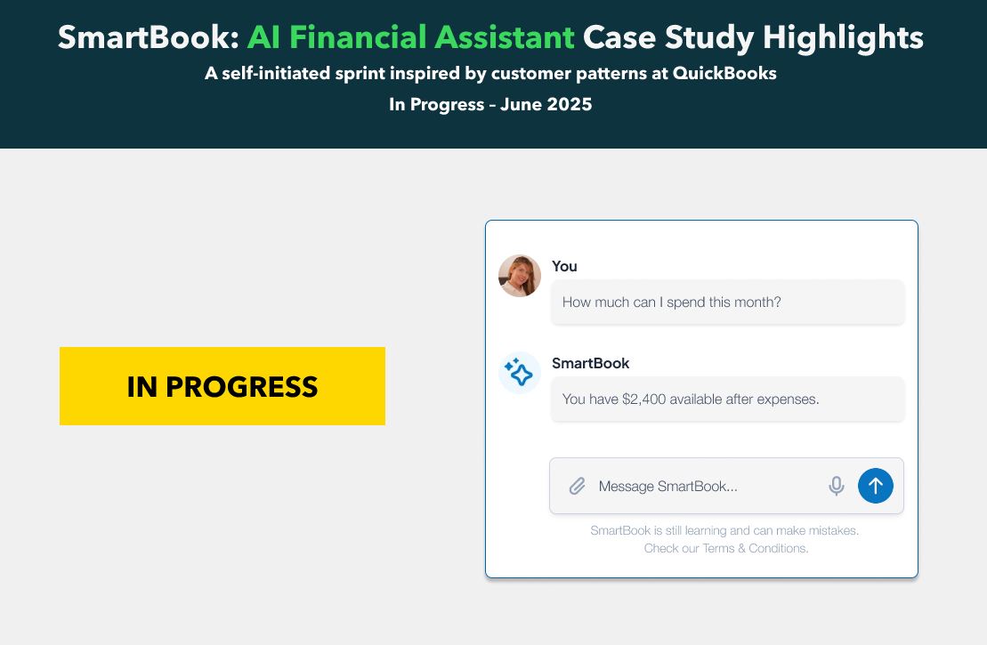 SmartBook is an AI-powered accountant designed to assist small businesses plan, forecast and make informed financial decisions. This case study examines how generative AI can be incorporated into QuickBooks via a conversational planning window, drawing inspiration from Intuit Assist.